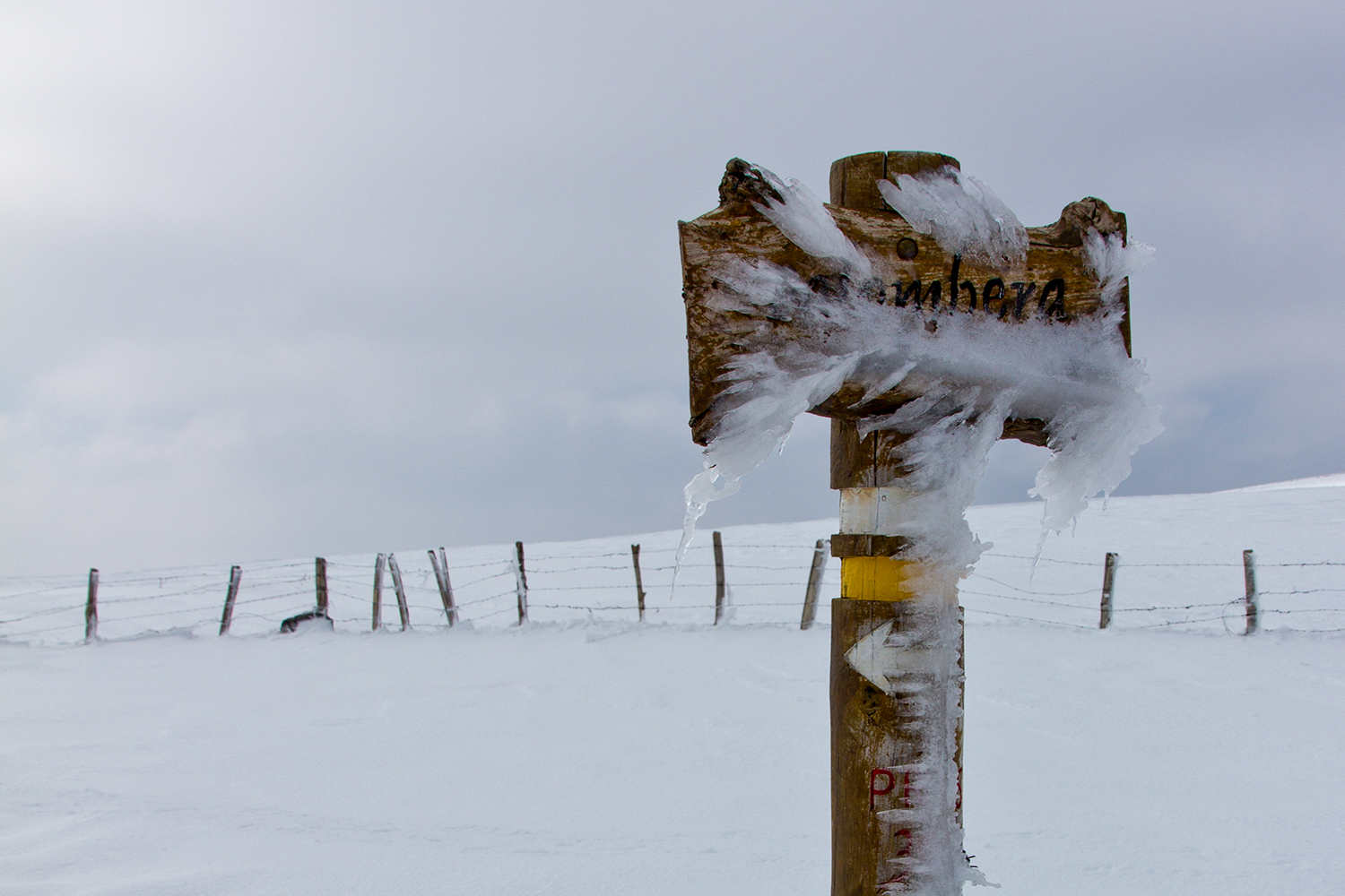 El día amaneció cubierto de nubes y con algo de bruma, no es lo mejor para tener buenas vistas desde este céntrico punto pero las ganas de nieve lo suplen todo. Llegamos justo antes de que cerrasen la carretera de Palombera y conseguimos aparcar a la entrada del camino que lleva a la Cruz, en un principio queríamos seguir el sendero pero la gran acumulación de nieve que formaba enormes cornisas nos hizo ir mas «a derecho», la verdad que ver caer una de estas cornisas tiene que asustar lo suyo por lo que no nos acercamos mucho a ellas.